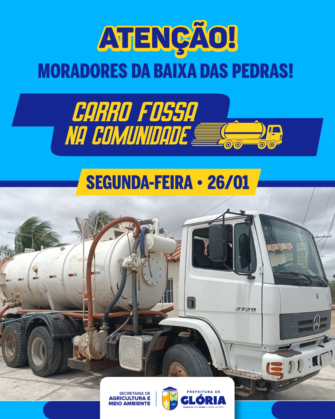 A Prefeitura Municipal de Glória informa que o serviço de esgotamento sanitário estará disponível na localidade.