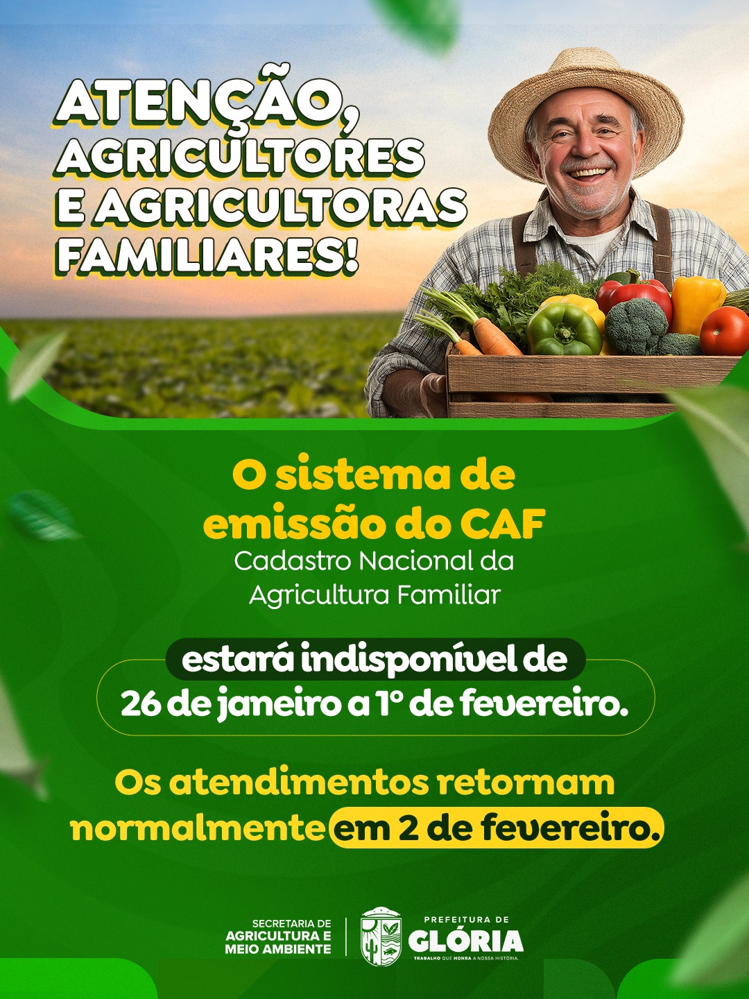 A Prefeitura Municipal de Glória, por meio da SEAGRI – Secretaria de Agricultura e Meio Ambiente, informa aos agricultores e agricultoras familiares que o sistema de emissão do CAF (Cadastro Nacional da Agricultura Familiar) estará indisponível no período de 26 de janeiro a 01 de fevereiro.