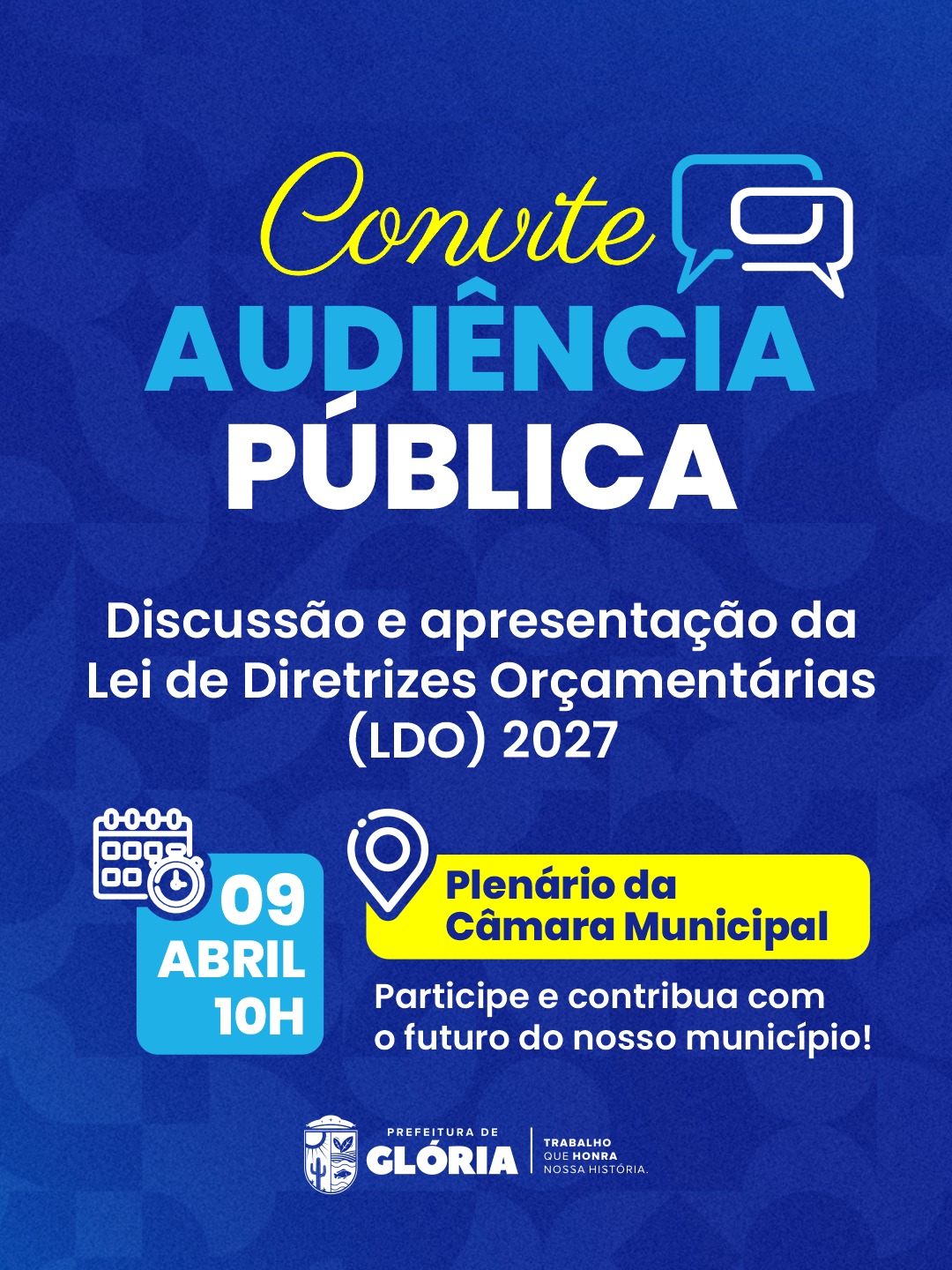 A Prefeitura de Glória convida toda a população para participar da Audiência Pública de discussão e apresentação da Lei de Diretrizes Orçamentárias (LDO) 2027. O encontro será realizado no dia 9 de abril, às 10h, no Plenário da Câmara Municipal, e tem como objetivo promover a transparência e a participação popular na construção do planejamento orçamentário do município. Durante a audiência, serão apresentadas as diretrizes que irão orientar a elaboração do orçamento para o próximo ano, além de abrir espaço para que os cidadãos possam contribuir com sugestões e apontamentos. A participação da comunidade é fundamental para garantir que as decisões estejam alinhadas às reais necessidades da população.