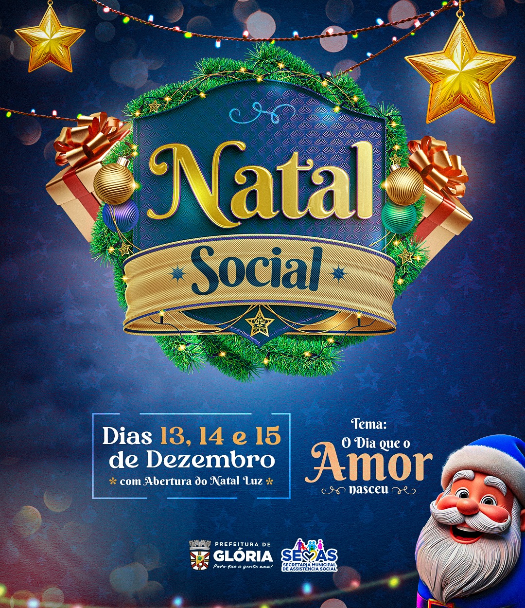 A cidade de Glória já está no clima natalino, e o Natal Social 2024 promete encantar toda a comunidade com três dias de programação especial. O evento, realizado pela Prefeitura Municipal de Glória, por meio da Secretaria de Assistência Social, acontece nos dias 13, 14 e 15 de dezembro, na Praça Adair Pereira Leite, com o tema "O Dia que o Amor Nasceu".